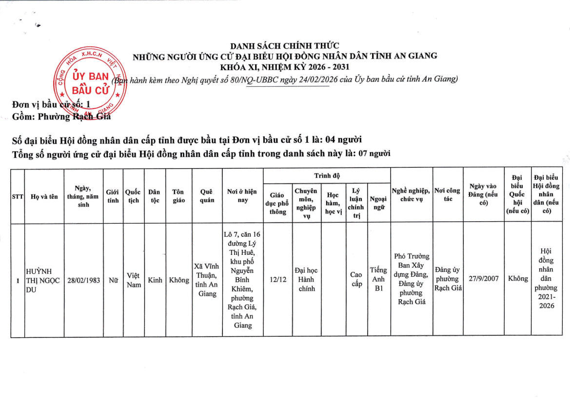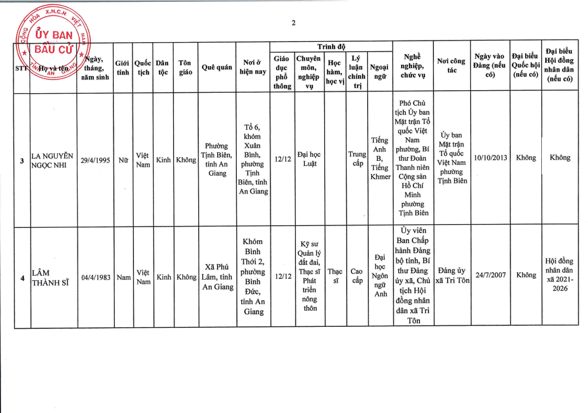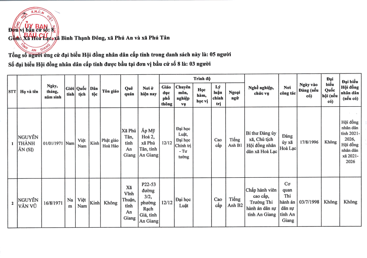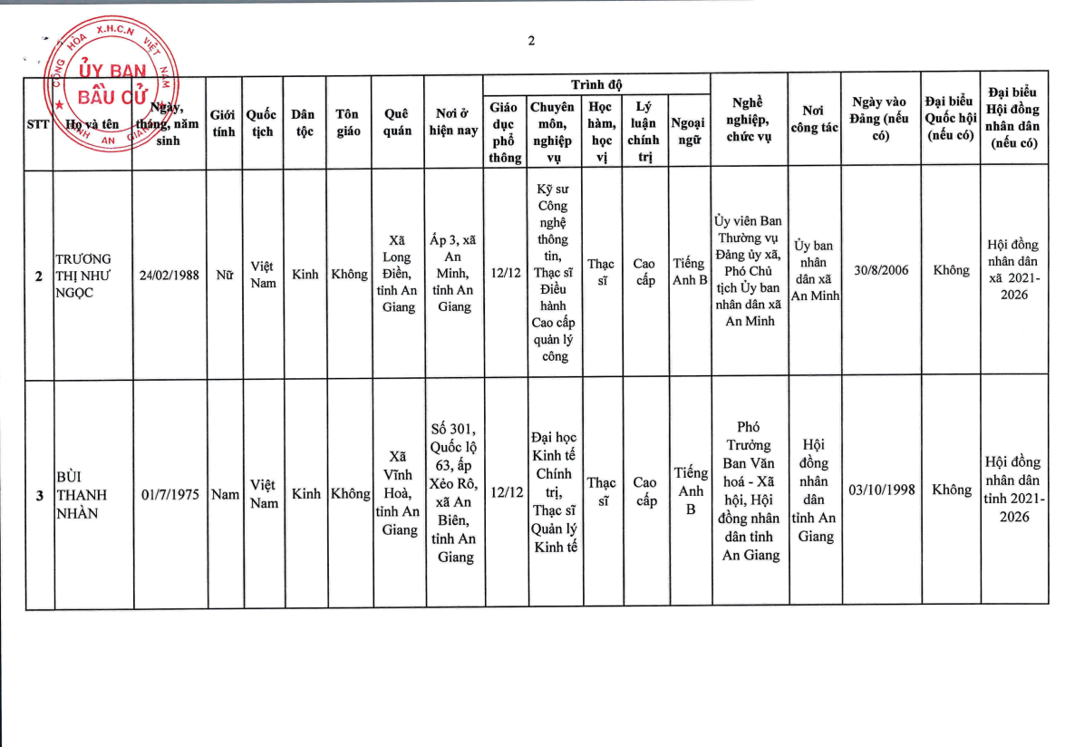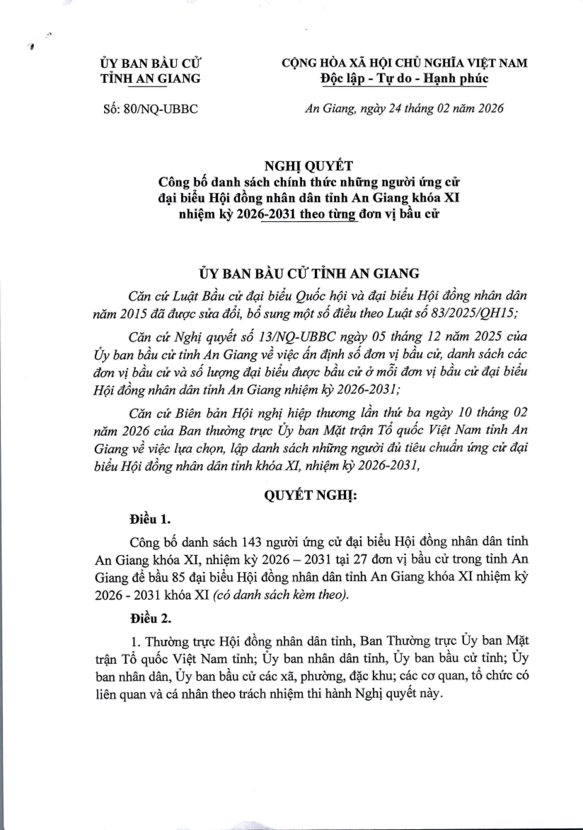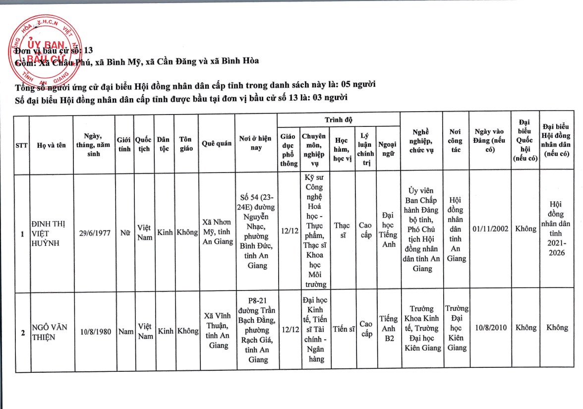 Công bố danh sách chính thức những người ứng cử đại biểu Hội đồng nhân dân tỉnh An Giang khóa XI nhiệm kỳ 2026 - 2031 theo từng đơn vị bầu cử
