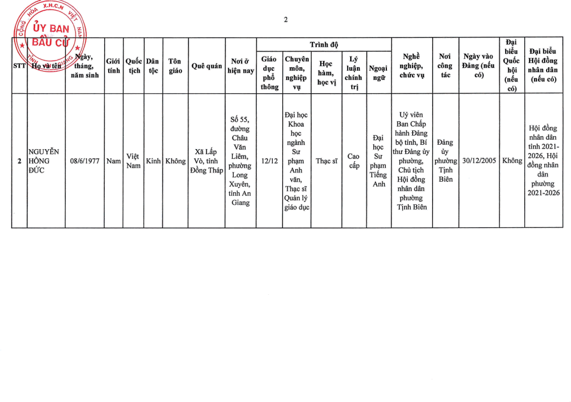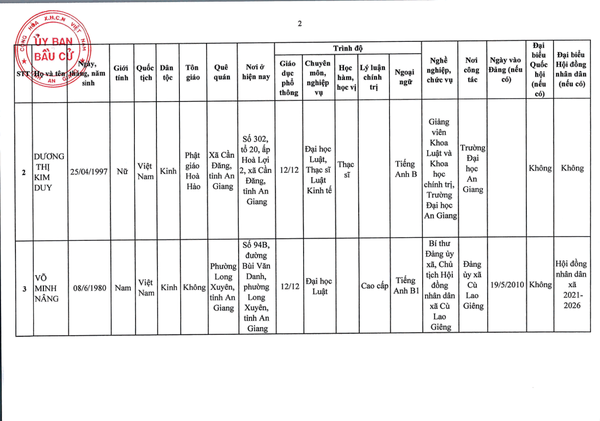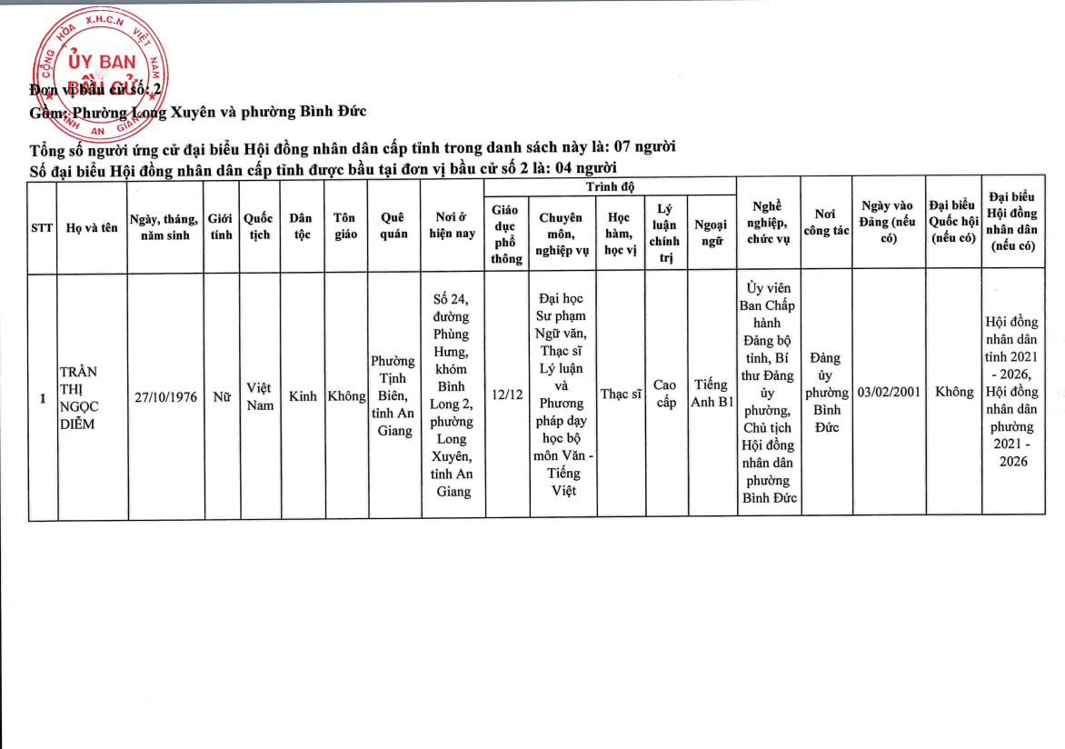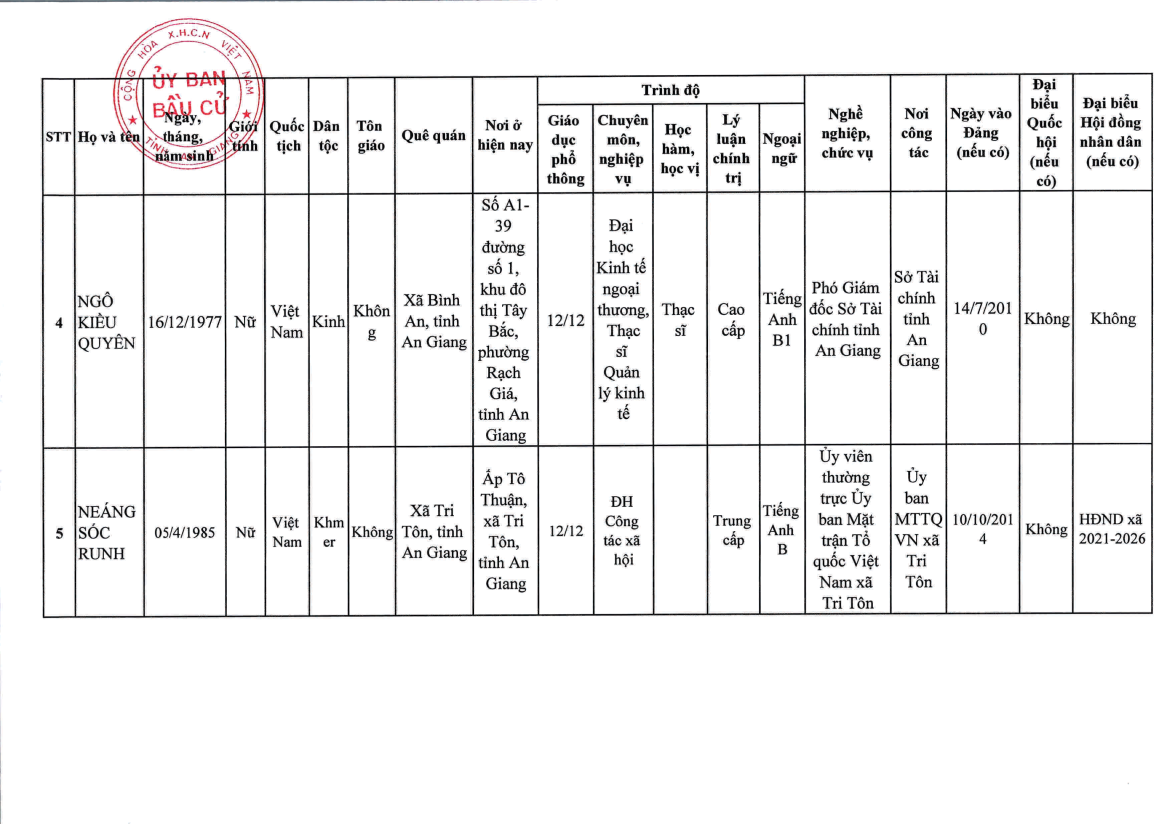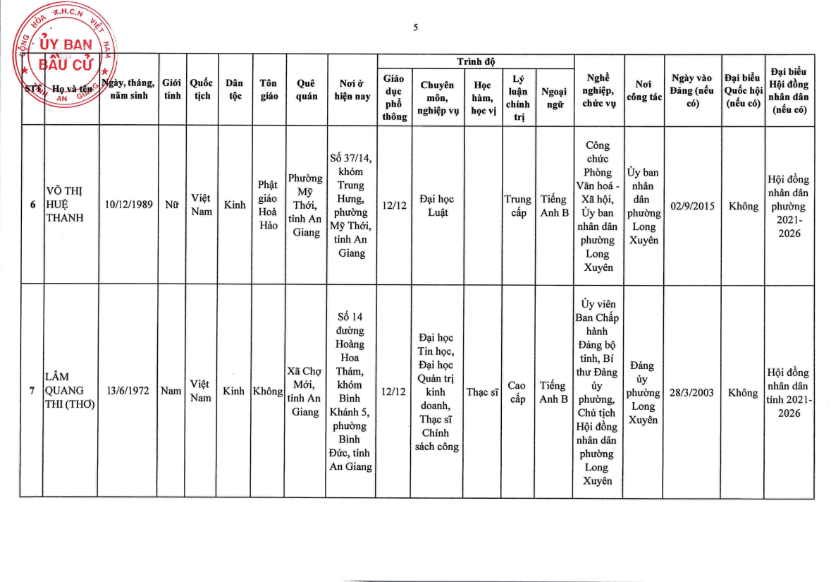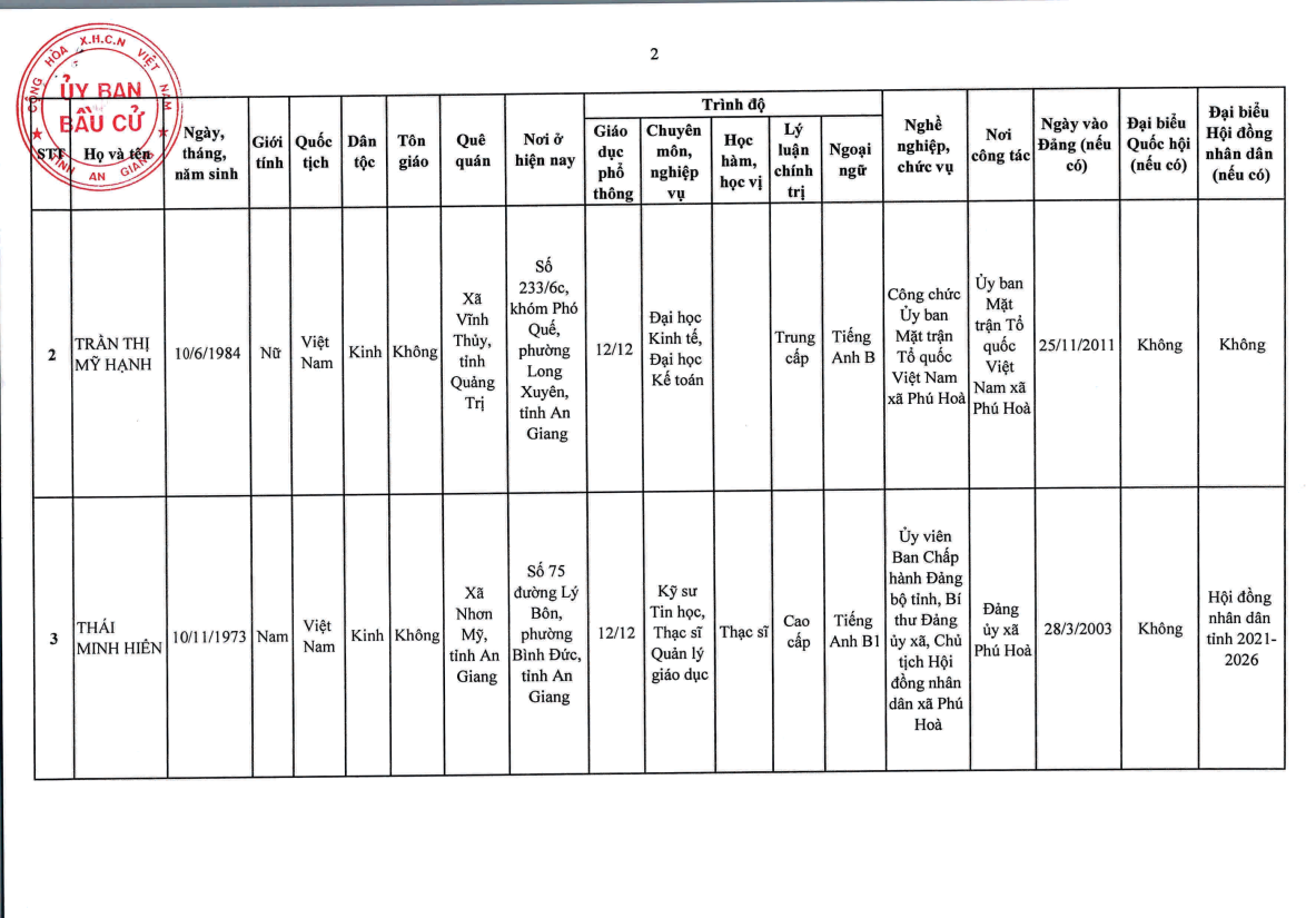 Công bố danh sách chính thức những người ứng cử đại biểu Hội đồng nhân dân tỉnh An Giang khóa XI nhiệm kỳ 2026 - 2031 theo từng đơn vị bầu cử