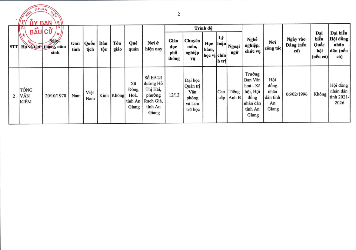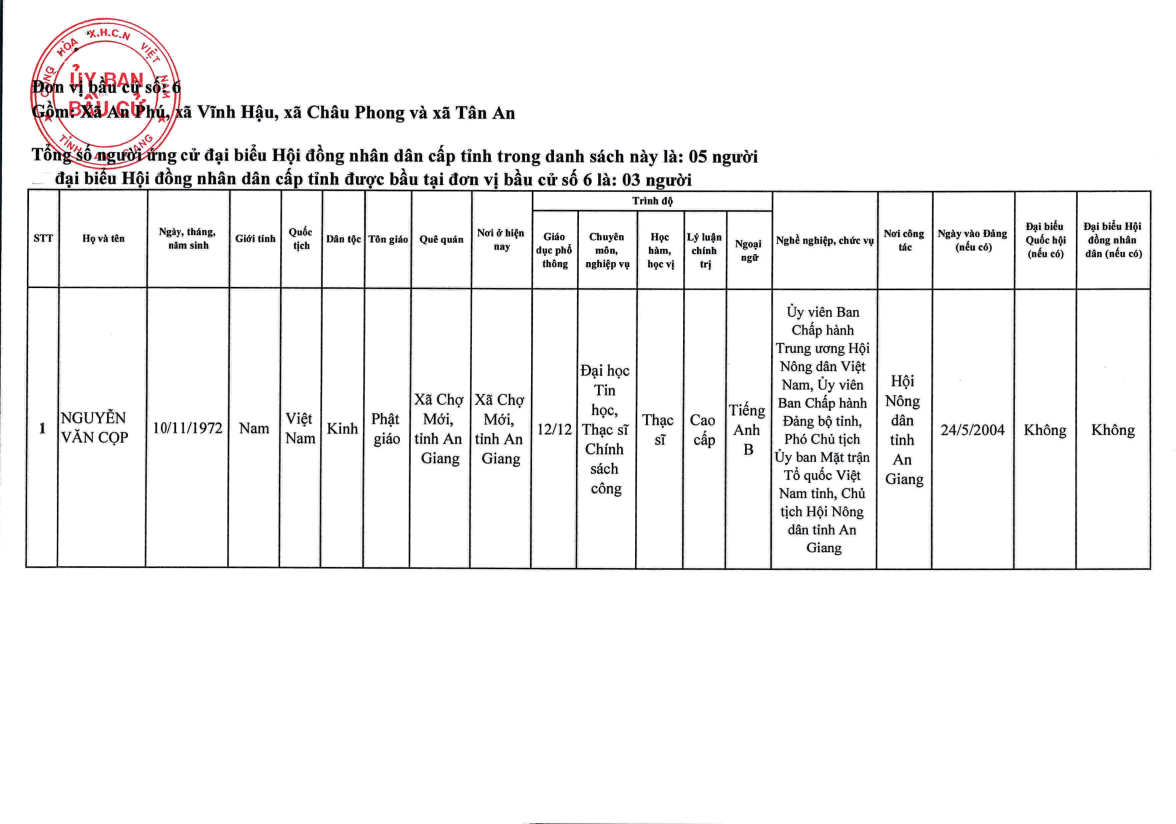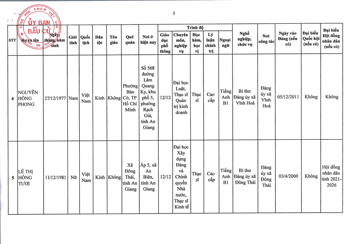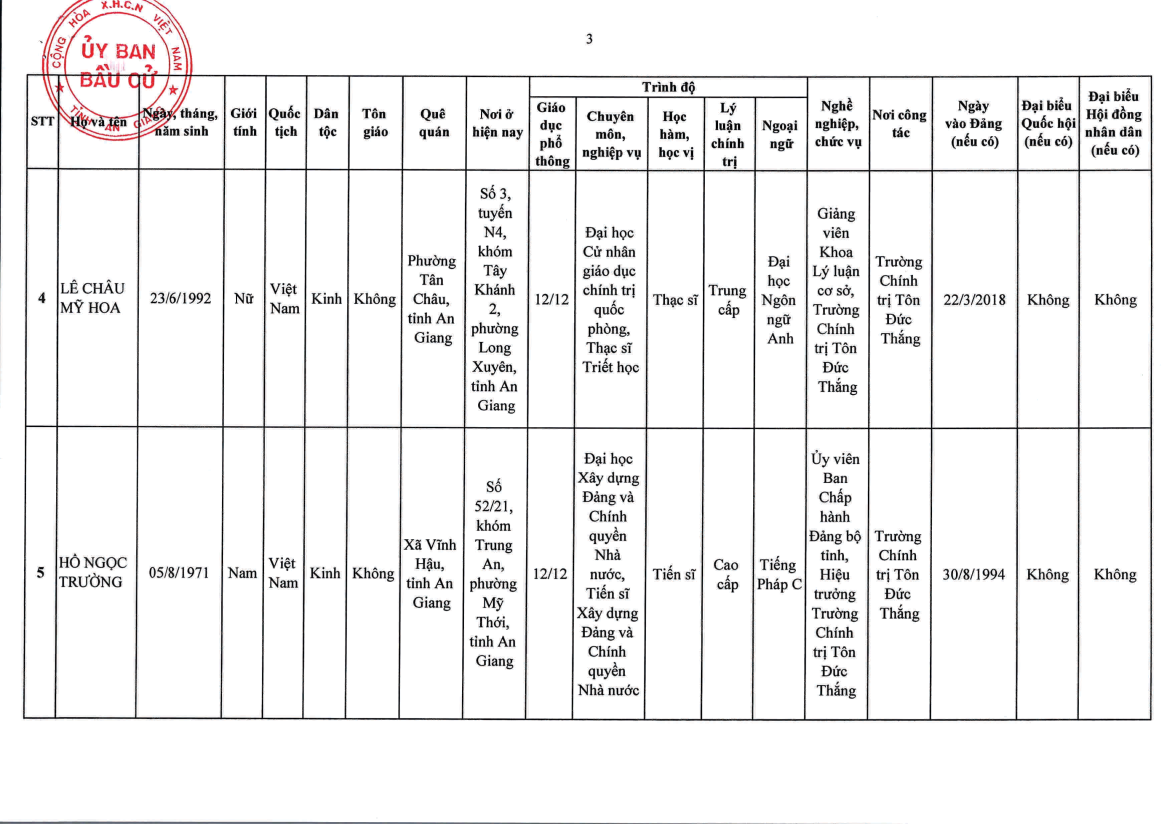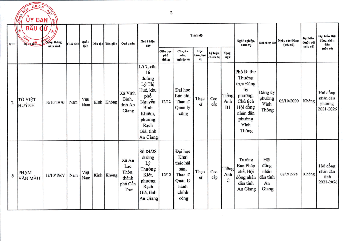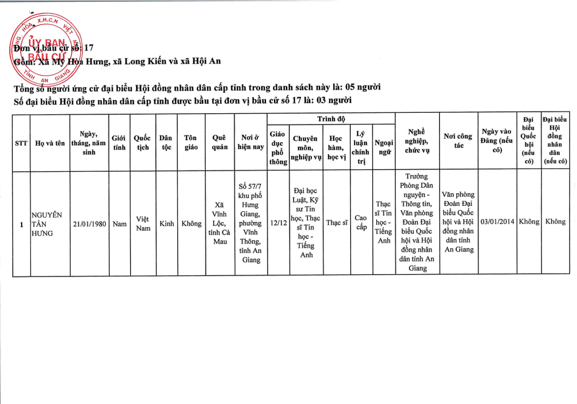Công bố danh sách chính thức những người ứng cử đại biểu Hội đồng nhân dân tỉnh An Giang khóa XI nhiệm kỳ 2026 - 2031 theo từng đơn vị bầu cử