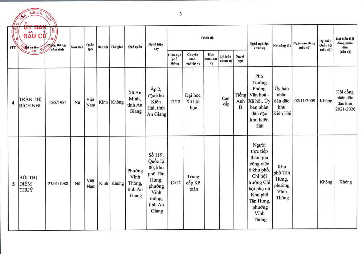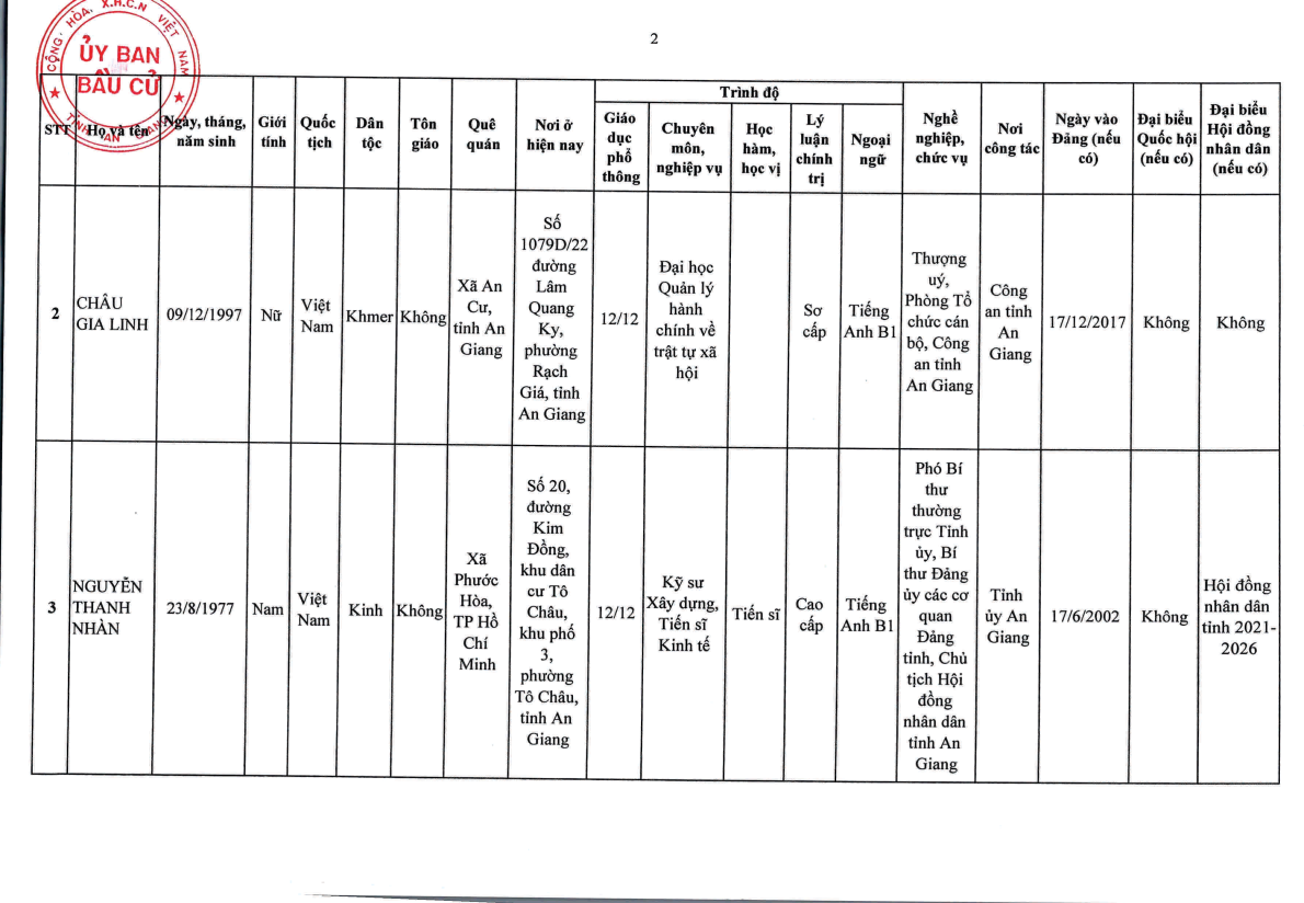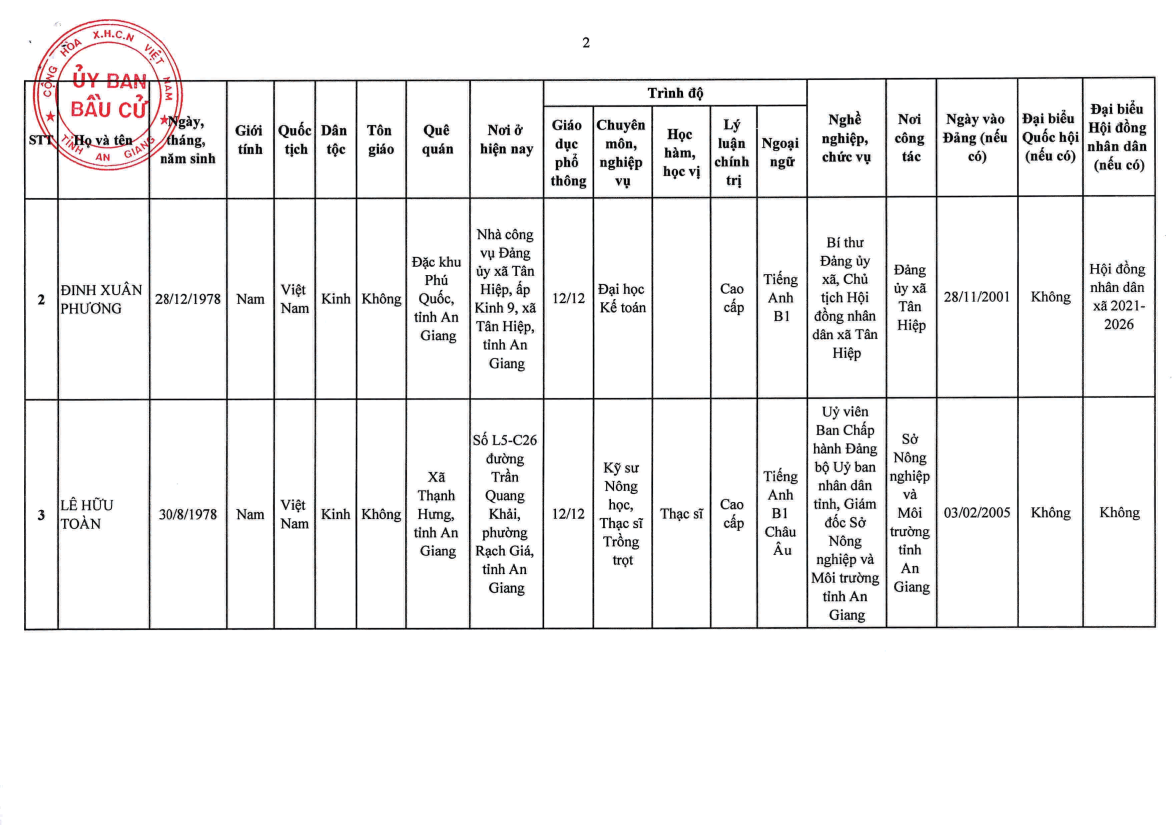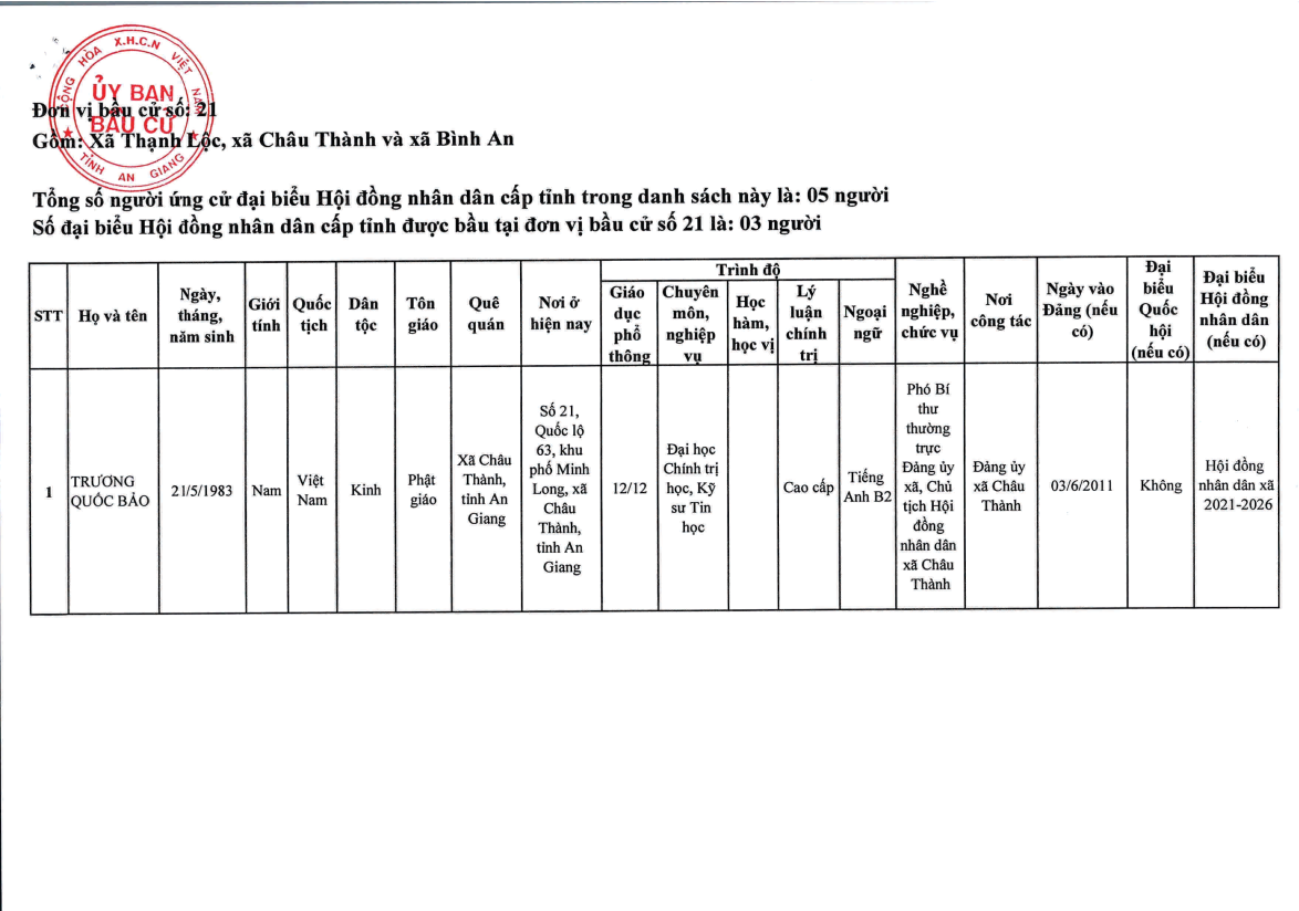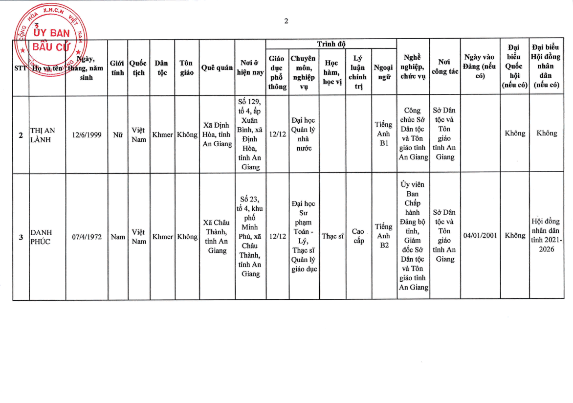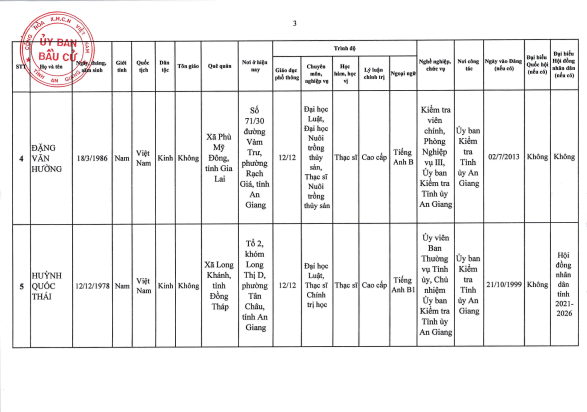 Công bố danh sách chính thức những người ứng cử đại biểu Hội đồng nhân dân tỉnh An Giang khóa XI nhiệm kỳ 2026 - 2031 theo từng đơn vị bầu cử