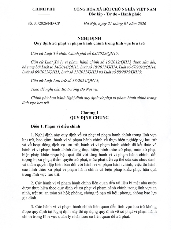 Ngày 21/01/2026, Chính phủ ban hành Nghị định số 31/2026/NĐ-CP quy định xử phạt vi phạm hành chính trong lĩnh vực lưu trữ. Nghị định được ban hành nhằm hoàn thiện cơ sở pháp lý cho việc xử lý các hành vi vi phạm, góp phần nâng cao hiệu lực, hiệu quả quản lý nhà nước về công tác lưu trữ và bảo vệ an toàn tài liệu lưu trữ quốc gia.