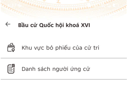 Bước 4: Tại màn chức năng Bầu cử Quốc hội XVI, chọn “Khu vực bỏ phiếu của cử tri” hoặc “Danh sách người ứng cử” tại Khu vực nếu muốn xem.