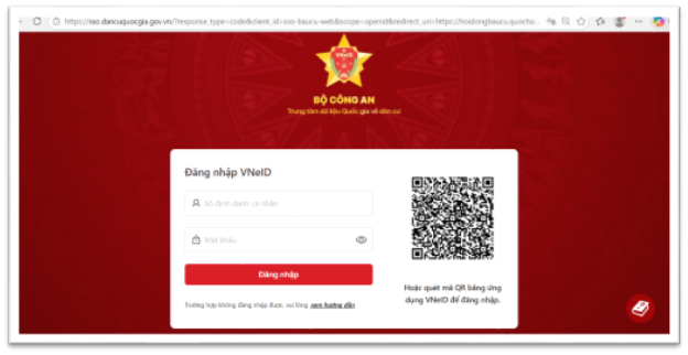 Bước 3: Đăng nhập bằng tài khoản VneID: nhập số căn cước công dân, mật khẩu, mã OPT gửi về số điện thoại đăng ký VneID. Hoặc sử dụng mã quét trên ứng dụng VneID để quét mã QR đăng nhập.