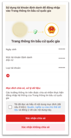 Bước 4: Tích vào ô: “Tôi đã đọc và hiểu rõ nội dung mục đích (đã nêu trên)”, ấn Xác nhận chia sẻ, sau đó nhập mã Code của ứng dụng VneID.