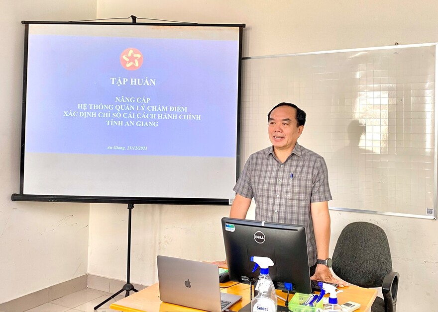 Sáng ngày 21/12/2023, Sở Nội vụ tổ chức Lớp tập huấn hướng dẫn sử dụng phần mềm Chấm điểm chỉ số cải cách hành chính tỉnh An Giang. Ông Trương Long Hồ, Phó Giám đốc Sở Nội vụ dự và chỉ đạo lớp tập huấn.
