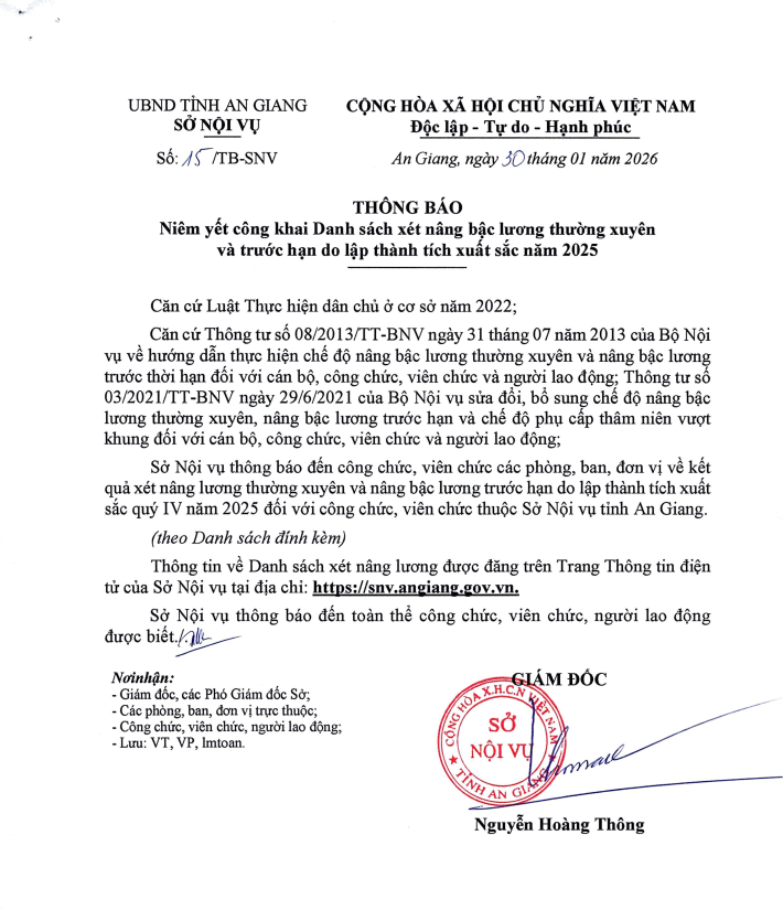 Thông báo niêm yết công khai Danh sách xét nâng bậc lương thường xuyên và trước hạn do lập thành tích xuất sắc năm 2025 Thông báo 02/02/2026 - aA + /thong-bao-niem-yet-cong-khai-danh-sach-xet-nang-bac-luong-thuong-xuyen-va-truoc-han-do-lap-thanh Tài liệu đính kèm: 15_0008_1.pdf (1.92 MB) Tin tức liên quan Về việc tiếp công dân định kỳ tháng 02/2026 Thông báo 23/02/2026 Lịch công tác Ban Giám đốc Sơ· Thông báo 02/02/2026 Về việc tiếp công dân định kỳ tháng 01/2026 Thông báo 13/01/2026 Về việc tiếp nhận hồ sơ ứng cử đại biểu Quốc hội khóa XVI và ứng cửđại biểu Hội đồng nhân dân tỉnh nhiệm kỳ 2026 - 2031 Công tác bầu cử Thông báo 12/01/2026 Về việc thanh lý tài sản cố định và công cụ, dụng cụ của Sở Nội vụ Thông báo 28/12/2025 Lịch làm việc của Ban Giám đốc Sở Nội vụ từ ngày 22/12/2025 đến 26/12/2025 Thông báo Lịch làm việc 24/12/2025