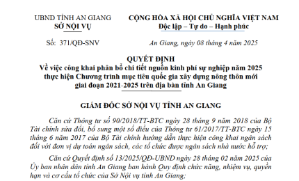 Công khai phân bổ chi tiết nguồn kinh phí sự nghiệp năm 2025 thực hiện Chương trình mục tiêu quốc gia xây dựng nông thôn mới giai đoạn 2021-2025 trên địa bàn tỉnh An Giang