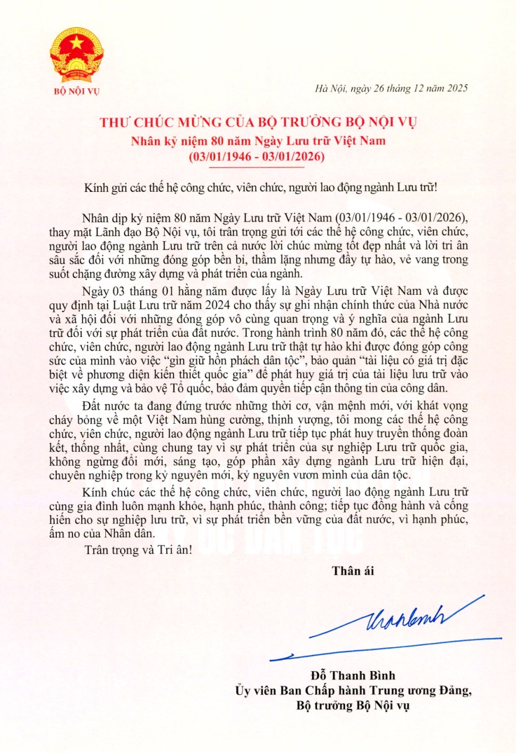 Thư chúc mừng của Bộ trưởng Bộ Nội vụ nhân kỷ niệm 80 năm Ngày Lưu trữ Việt Nam (03/01/1946 - 03/01/2026) Chi cục Văn thư - Lưu trữ 29/12/2025 - aA + /thu-chuc-mung-cua-bo-truong-bo-noi-vu-nhan-ky-niem-80-nam-ngay-luu-tru-viet-nam-03011946-03012026 Tài liệu đính kèm: Thu gui nganh luu tru.pdf (352.58 KB) Tin tức liên quan TUYÊN TRUYỀN KỶ NIỆM 80 NĂM NGÀY LƯU TRỮ VIỆT NAM (03/01/1946 – 03/01/2026) Chi cục Văn thư - Lưu trữ 31/12/2025 Sở Nội vụ tỉnh An Giang tổ chức tập huấn nghiệp vụ Công tác văn thư, lưu trữ năm 2025 Chi cục Văn thư - Lưu trữ 30/12/2025 Sở Nội vụ tỉnh An Giang triển khai khảo sát công tác văn thư, lưu trữ tại 17 xã, phường, đặc khu năm 2025 Chi cục Văn thư - Lưu trữ 04/12/2025 V/v góp ý dự thảo Quyết định bãi bỏ các Quyết định quy phạm pháp luật về lĩnh vực văn thư, lưu trữ do UBND tỉnh ban hành Chi cục Văn thư - Lưu trữ 23/10/2025 Hội nghị trực tuyến toàn quốc phổ biến Luật Lưu trữ năm 2024 và các văn bản quy định chi tiết Luật Chi cục Văn thư - Lưu trữ 23/09/2025 An Giang Ban hành Quy định mới về mã định danh tài liệu, văn bản và hồ sơ Chi cục Văn thư - Lưu trữ 27/08/2025