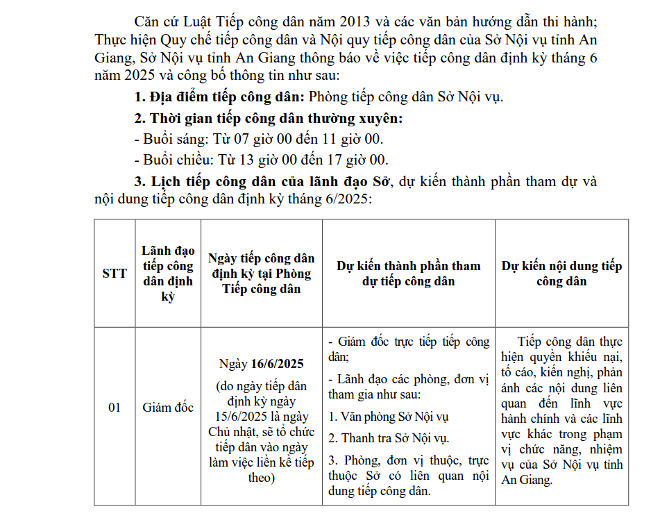 Về việc tiếp công dân định kỳ tháng 6/2025 Thông báo 12/06/2025 - aA + /ve-viec-tiep-cong-dan-dinh-ky-thang-62025 Tài liệu đính kèm: 1866 Thong bao thong tin tiep cong dan - thang 6 - 2025-trinhky.signed.pdf (548.12 KB) Tin tức liên quan THÔNG BÁO - Về việc tiếp công dân định kỳ tháng 11/2025 Thông báo 14/11/2025 Về việc tiếp công dân định kỳ tháng 10/2025 Thông báo 14/10/2025 Về việc tiếp công dân định kỳ tháng 9/2025 Thông báo 05/09/2025 Về việc tiếp công dân định kỳ tháng 5/2025 Thông báo Lịch làm việc 13/05/2025 Tổ chức chương trình đối thoại giữa lãnh đạo Ủy ban nhân dân tỉnh với thanh niên tỉnh An Giang năm 2024 Cải cách hành chính và Xây dựng chính quyền Thông báo 22/02/2024 Sở Nội vụ trao Quyết định về công tác cán bộ Văn phòng sở Thông báo 20/02/2024